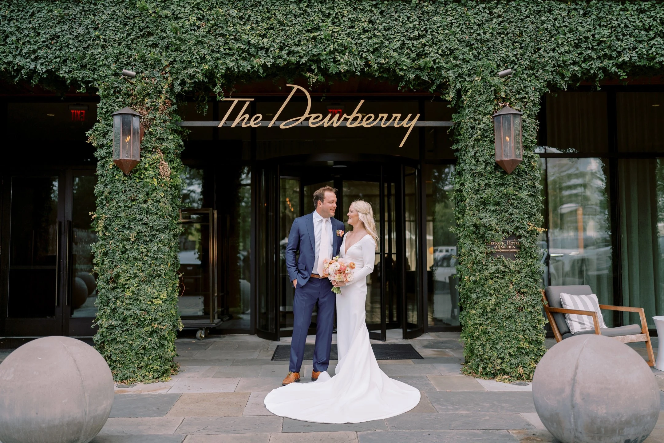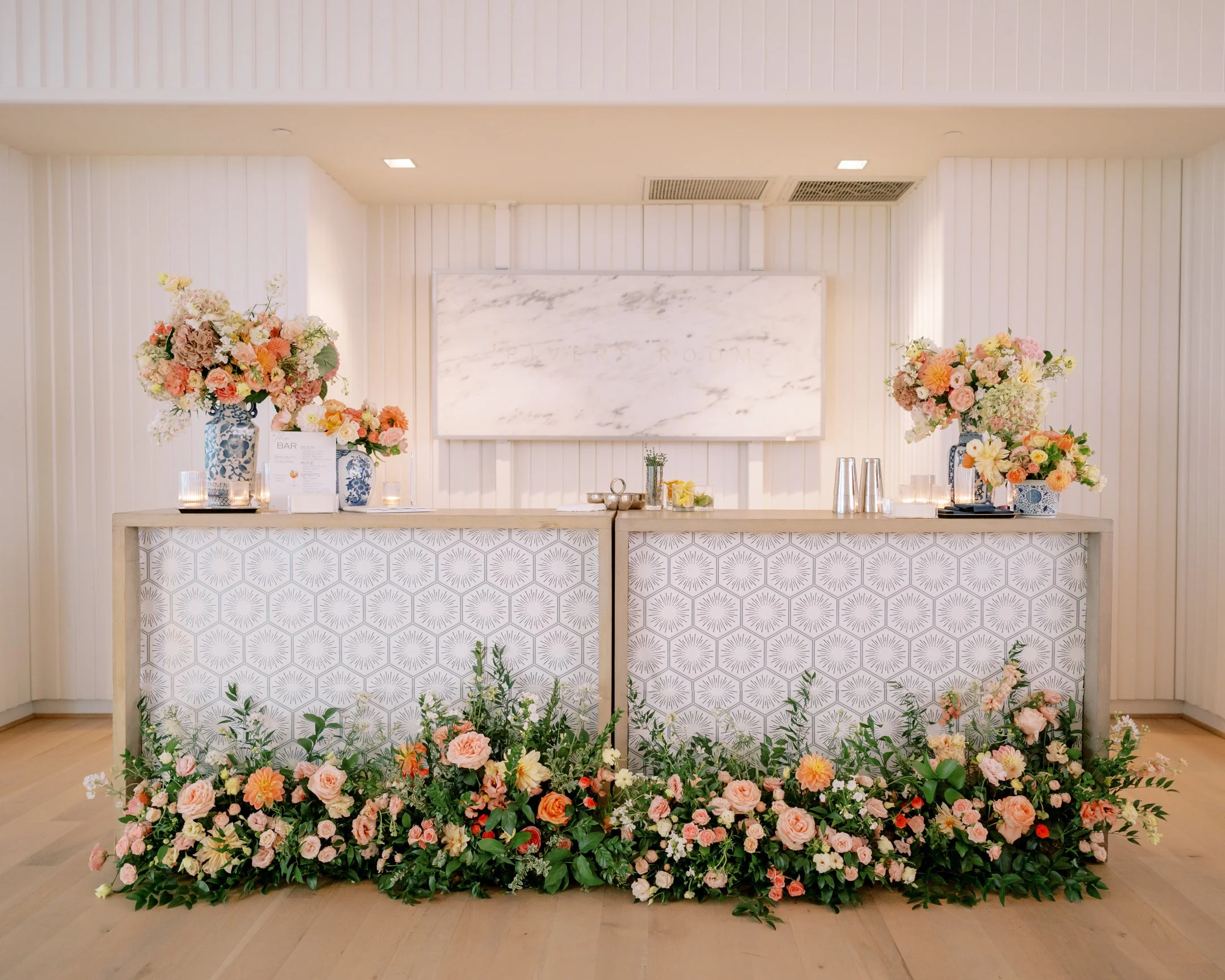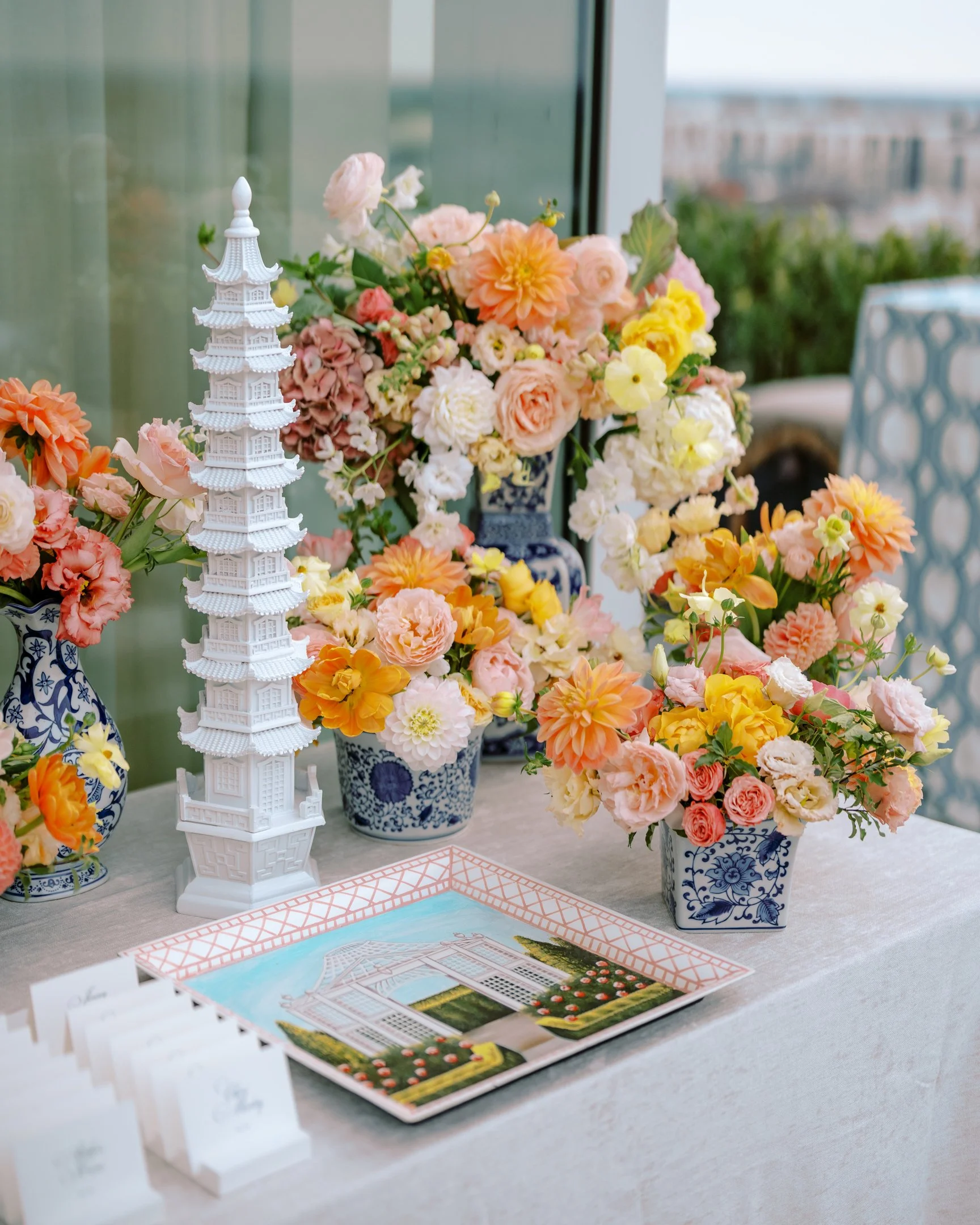 A garden inspired rooftop wedding using lush blooms, ranging from passionate pinks to radiant yellows, intertwine with foliage, creating a living tapestry that dances with the gentle breeze on top the Dewberry Hotel in the heart of Charleston.